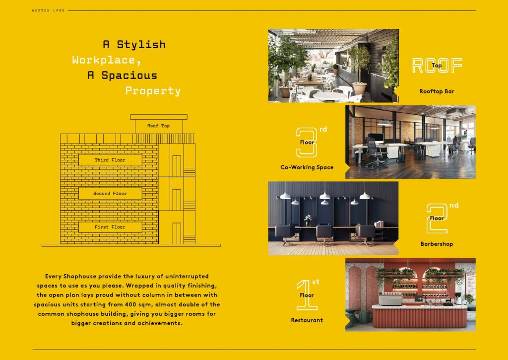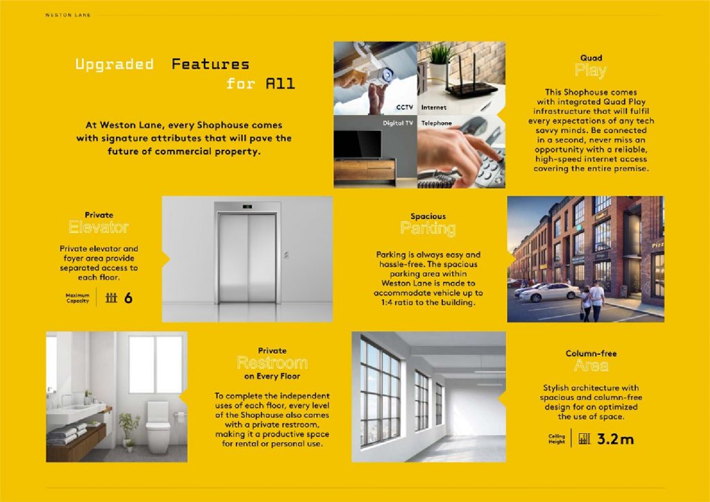 Sangat cocok untuk Bisnis Kuliner, Cafe, Restoran, Bank, Perkantoran, Salon, Klinik, dan segala jenis usaha lainnya. Dan Ruko Weston Lane ini memiliki potensi harga sewa yang tinggi karena konsepnya sangat menarik dengan ukuran lebar 8×18 dan lebar 9×18 dan disediakan Lift dan tangga khusus dari depan ruko sehingga bisa disewakan terpisah per lantai